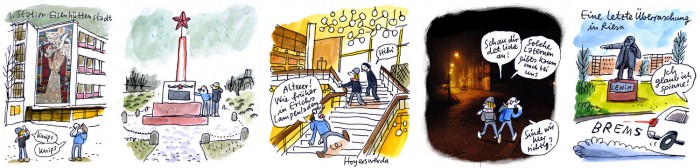 Zwei sentimentale alte Säcke auf der Suche nach ihrer verlorenen Kindheit : Jochen Schmidt schreibt eine neue Gebrauchsanweisung für Ostdeutschland und Mawil durfte ihn im Februar 2015 auf einer seiner Recherche-Reisen durch Eisenhüttenstadt, Guben, Hoyerswerda, Dresden und Riesa begleiten. Mehr dazu auf Jochen seinem Blog oder in Mawils Sonntagscomic am 1.3.2015 im Tagesspiegel.