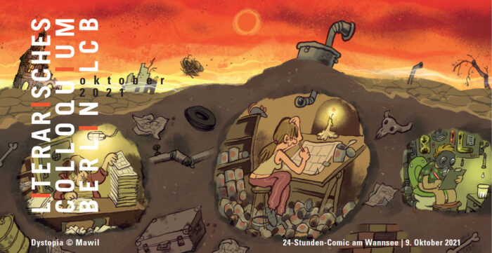 So eine sportliche und improvisative Herausforderung hält man leider nur schwer alleine durch. Zum Glück gibts da zB. das Literarische Colloquium Berlin und den fleissigen Brasilianer Augusto Paim der dort im Oktober 2021 eine solche Veranstaltung kuratiert hat. (Danke!) Das komische Thema „Zu eng“ wurde vor Ort von Auge Lorenz ausgelost.