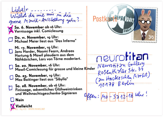 Anfang der 90er Jahren kopierte ein jugendlicher Nerd sein erstes Comic-Heft auf dem neuen Kopierer seiner Ostberliner Kirchengemeinde, um es im Bekanntenkreis zu vertreiben. 30 Jahre und einige Hefte und Bücher später darf das Ganze mal etwas grösser gefeiert werden – mit einer Ausstellung im Berliner Neurotitan, mit Kollegen, Lesungen, Talks, Signierstunden, 3Gs und zwei neuen (Kinder)Comicbüchern :