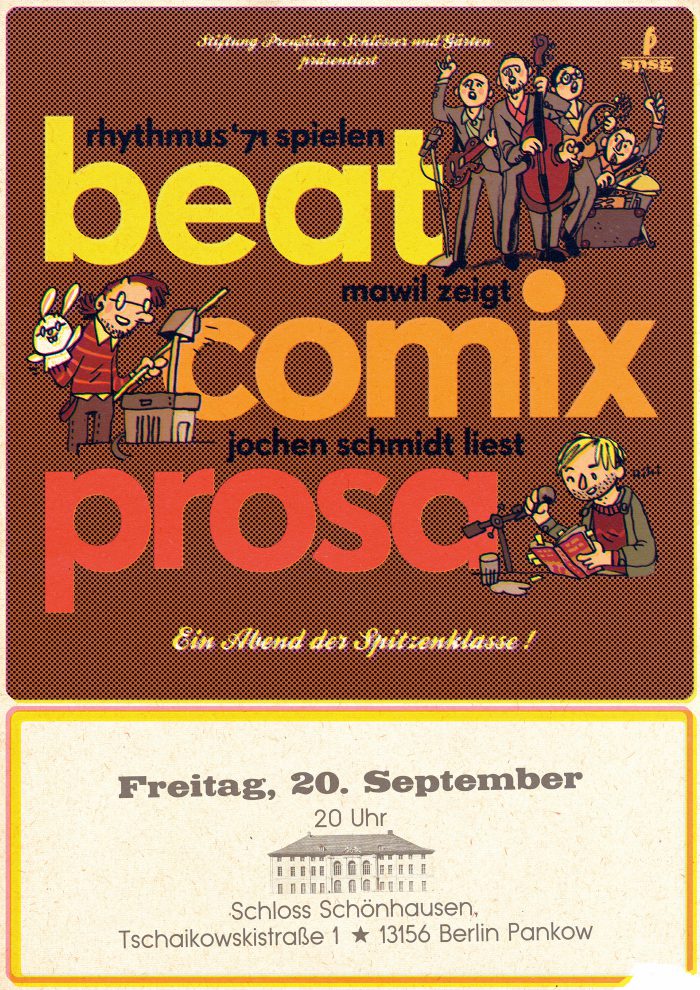 Comiclesungen gibt es inzwischen viele, aber manchmal hält das Leben etwas ganz Besonderes für euch bereit: In Anlehnung an die klassischen „Jazz Lyric Prosa“-Veranstaltungen wird sich am Freitag, dem 20. September, zum 2. Mal ein ganz besonderer und einzigartiger Beat Comix Prosa-Abend im schnieken Barocksaal des Schloss Schönhausens zu Berlin Pankow die Ehre geben. Die Freunde von Rhythmus ’71 spielen osteuropäische Beatmusik, Jochen Schmidt liest die Besten seiner Texte und Mawil zeigt dazu eine Auswahl seiner Comix. Eine Kartenvorbestellung unter 030 403 949 2625 oder schloss-schoenhausen@spsg.de wird empfohlen.