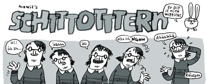 Ein altes Comic über eine eine alte Angst : Mawils autobiografische Kurzgeschichte „Schtttotttern“ von 2006, erstveröffentlicht in der Anthologie flitter und später im Sammelband Action Sorgenkind erschienen, gibts jetzt nochmal auf www.fluter.de zum Thema „Angst“ und kann dort komplett gelesen werden. Keine Angst, is lustig !