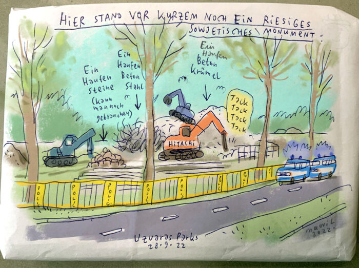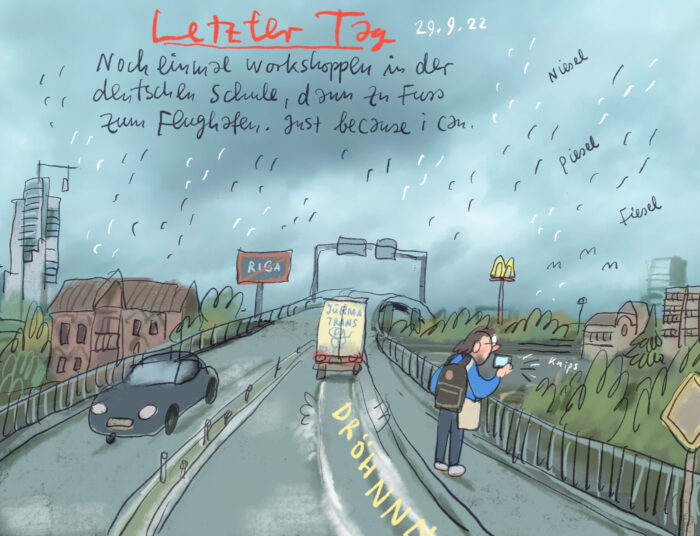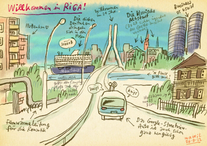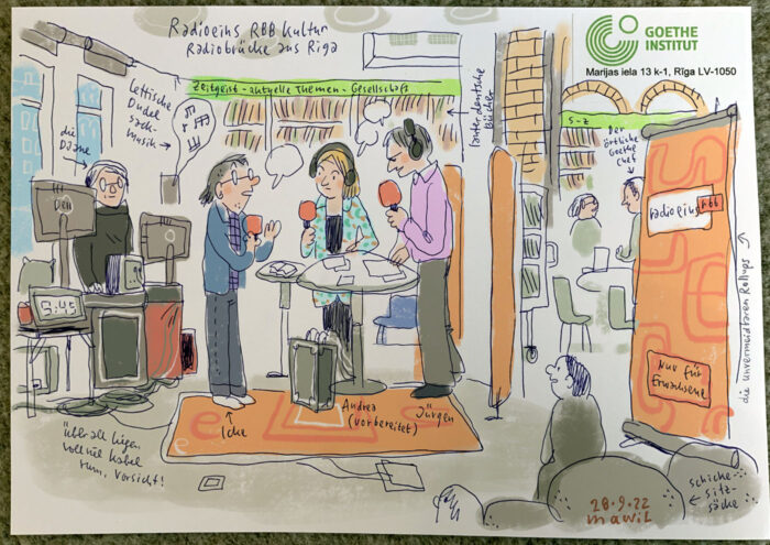 Witzigerweise sendet gerade der Berliner Fernsehsender Radio Eins mit einer „Radiobrücke“ aus dem örtlichen Goethe-Institut und bittet Mawil, doch endlich mal wieder richtige Reiseskizzen statt schnöder Handyfotos zu machen.