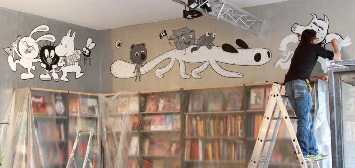 Modern Graphics, der freundliche Comicladen aus Berlin-Kreuzberg, eröffnet eine neue Filiale in der Prenzlberger Kastanienallee mit Reprodukt-Schwerpunkt und vielen Kindercomics. Reprodukts alte Hasen Moki und Mawil gestalten die dezente Wandbemalung mit den Kindercomic-Helden Supa-Hasi, dem kleinen Strubbel, Mumin, der Fliege, Flummi, Mouk, Kiste, Froga, dem Moki-Fuchswesen (vlnr) und Didi (nich so kindgerecht). Live zu erleben bei Modern Graphics, Kastanienallee 79, 10435 Berlin, Montag – Samstag 11- 20 Uhr. (Foto : Moki)