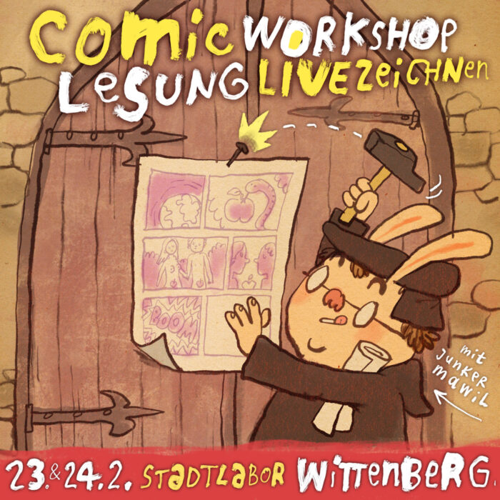 Unter dem Titel „Der Esel in der Stadt“ und als Kooperation zwischen der Buchhandlung „Der Esel auf dem Dach“ sowie dem Stadtlabor Wittenberg gibts fast ein ganzes Comic-Wochenende mit Mawil in besagtem Stadtlabor der Lutherstadt Wittenberg :